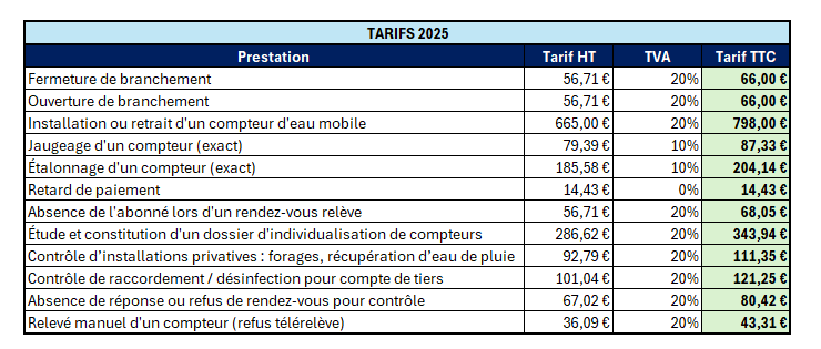 SEPIG met à votre disposition l’ensemble des tarifs en vigueur pour l’année 2025. Vous trouverez ci-dessous le détail des prestations liées à l’eau potable et à l’assainissement, ainsi que les montants applicables selon les réglementations en cours.