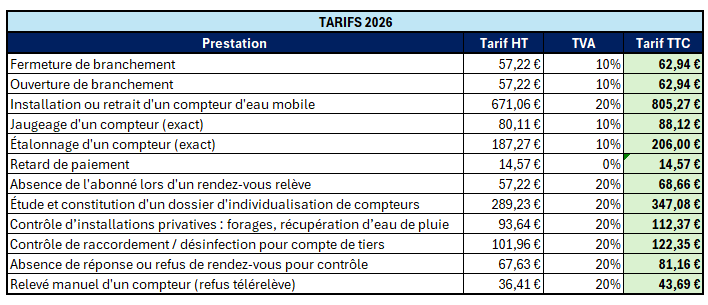 SEPIG met à votre disposition l’ensemble des tarifs en vigueur pour l’année 2026. Vous trouverez ci-dessous le détail des prestations liées à l’eau potable et à l’assainissement, ainsi que les montants applicables selon les réglementations en cours.